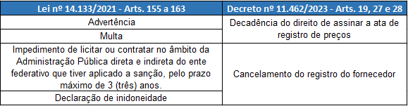 Tabela 1 - Sanções previstas em lei para Processos Administrativos - Lei nº 14.133/2021 e Decreto nº 11.462/2023