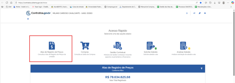 Tela inicial do sistema contratos.gov, com destaque para botão de registro de atas